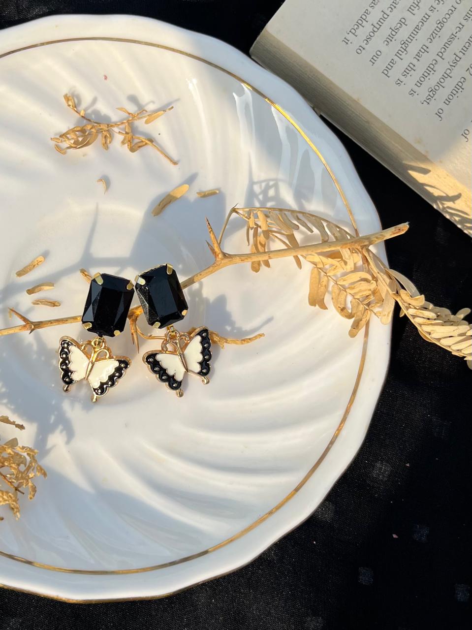 Add a touch of edgy charm to your jewelry game with Noir Papillon. These earrings feature a faceted black stone stud and whimsical enamel butterfly drops that combine monochrome elegance with a playful twist. Ideal for both brunch dates and bold evening looks.